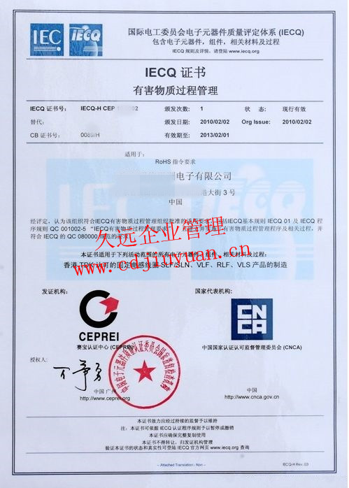 有害物質(zhì)過(guò)程管理體系認(rèn)證證書(shū)