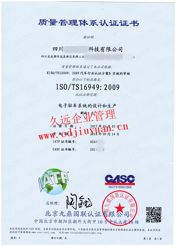 IATF16949汽車質(zhì)量管理體系認(rèn)證證書(shū)